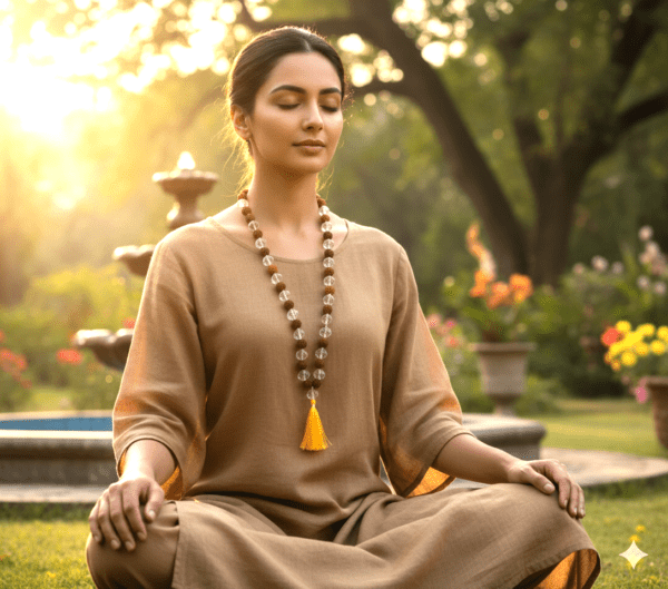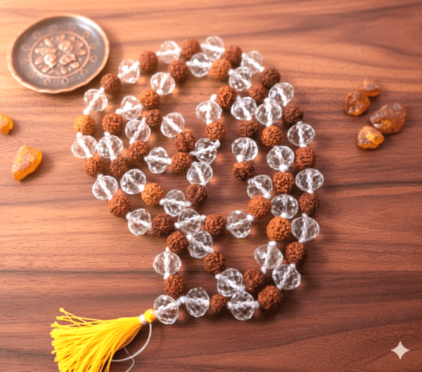 Crystal Rudraksha Mala is primarily dedicated to Lord Shiva and is associated with the planet Venus (Shukra). This mala combines the divine powers of crystal and Rudraksha. Crystal promotes peace of mind, concentration, and good fortune, while Rudraksha provides spiritual strength, protection, and positive energy. Wearing this mala helps calm the mind, reduce stress, and attract love, harmony, and prosperity in life. It is especially beneficial for those with a weak Venus in their horoscope or those facing imbalance in marital or emotional relationships.