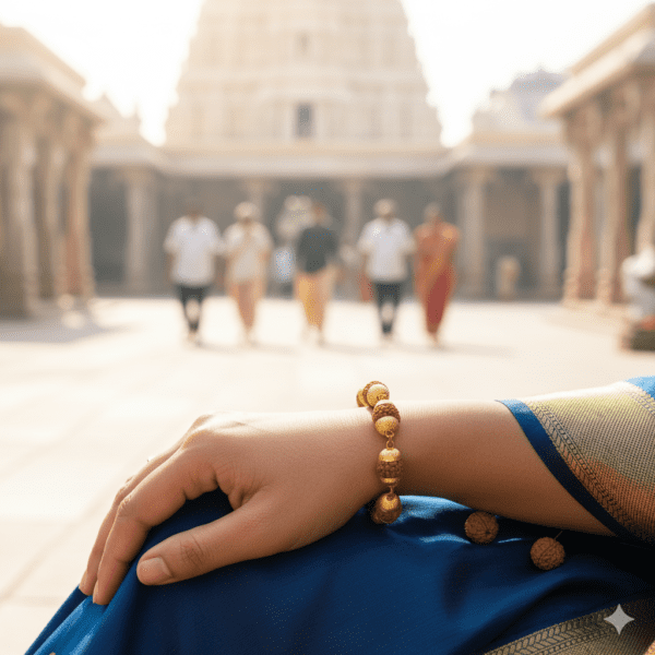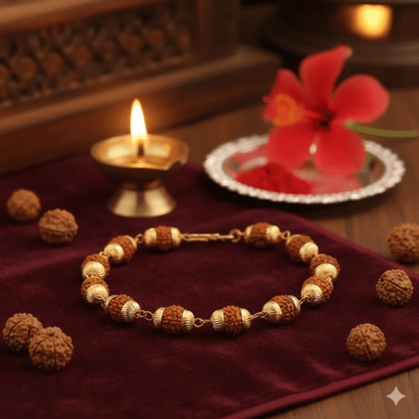 A Rudraksha bracelet in brass combines spiritual and physical benefits. Rudraksha beads are believed to enhance focus, calm the mind, and protect against negative energies. They promote emotional balance and reduce stress by stabilizing the heart and mind. Brass, known for its healing properties, helps improve blood circulation, strengthens immunity, and maintains body energy balance. Together, the Rudraksha and brass create a powerful synergy that supports meditation, boosts confidence, and promotes overall well-being. Wearing this bracelet daily is said to attract positivity, remove obstacles, and keep the wearer grounded and spiritually aligned with inner peace and strength.
