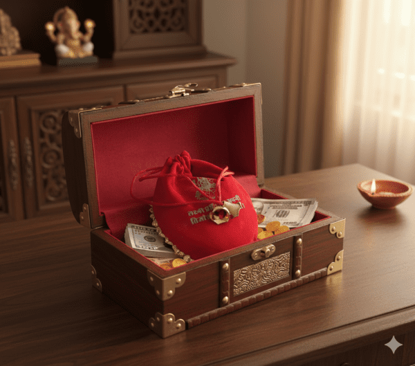 The Laxmi Dhan Potli is considered a symbol of Goddess Lakshmi and is believed to attract wealth, prosperity, and good fortune. Keeping it in the home or locker helps remove negative energy and invites positive vibrations. It promotes financial stability and helps overcome money-related problems. It is also considered auspicious for growth in business and career. Keeping the Laxmi Dhan Potli at home brings the blessings of Goddess Lakshmi, ensuring a life filled with happiness, abundance, and prosperity.